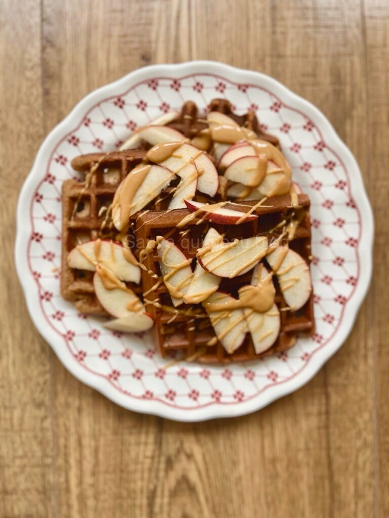 5. Il ne me reste plus qu’à couper quelques quartiers de pommes que je dispose sur mes gaufres avec la cuillère de beurre de cacahuète avant de pouvoir les dévorer 🙂
