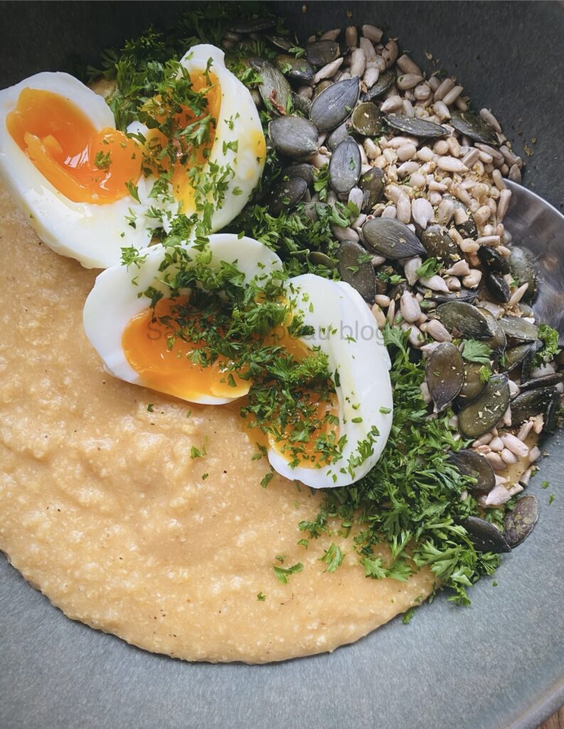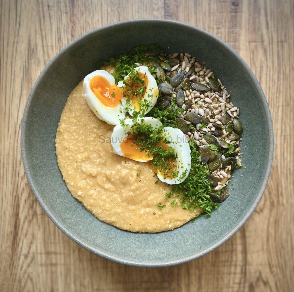 Du coup quand j’ai envie d’un déjeuner simple, sain mais qui change des pâtes ou du riz habituels, j’aime me faire un petit porridge salé, que j’agrémente comme ici de graines grillés pour la textures et les bons nutriments (Manger des graines pour se débarrasser de son acné ? Pourquoi et comment j’ai adopté le seed cycling pour sauver ma peau), et des oeufs mollets pour plus de protéines.