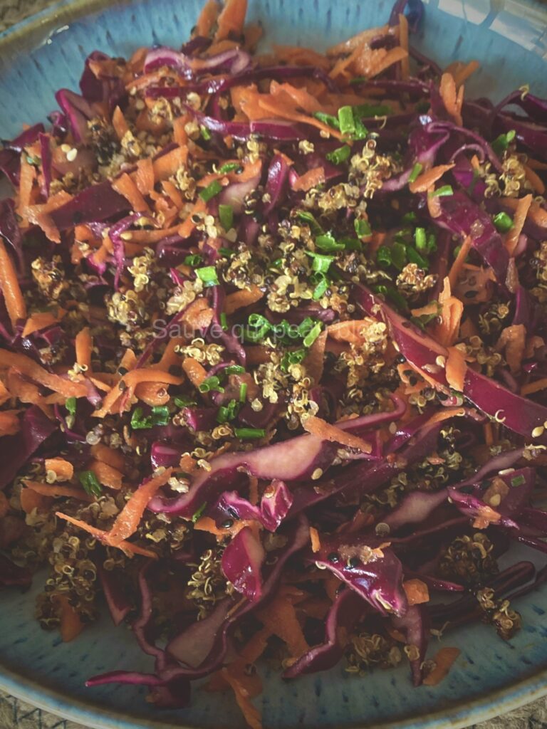 Grâce aux saveurs asiatiques de la sauce et au quinoa croustillant qui ajoute de la texture et des protéines, cette salade de chou rouge, carotte et quinoa croustillant est l’idéal pour un diner/repas léger ou en accompagnement.
