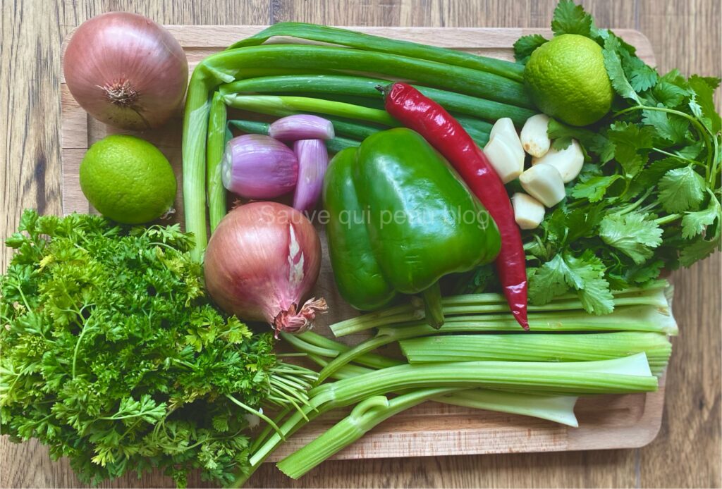 Qu’on l’appelle sofrito à Puerto rico, Green seasoning aux Etats-Unis, sauve verte dans certains pays africains et j’en passe et des meilleurs, cette petite sauce aux herbes fraîches concentrée de saveurs est vraiment un indispensable dans ma cuisine qui me permet de gagner du temps tout en ayant toujours à portée de main un assaisonnement maison, frais et plein de saveurs !