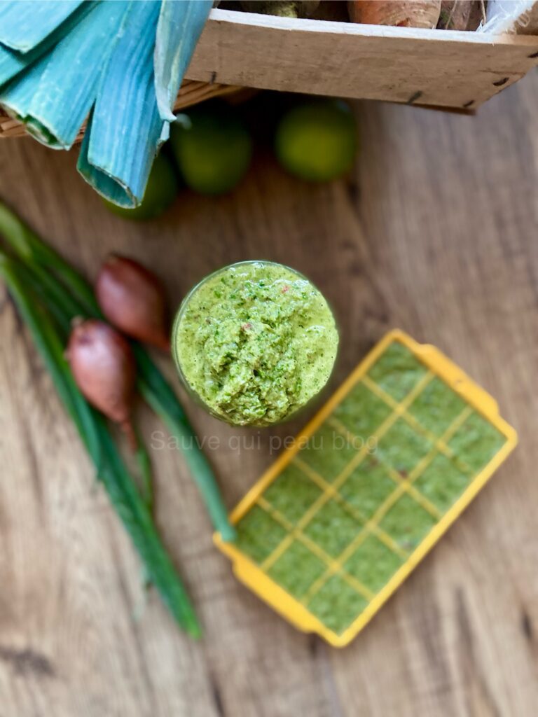 Du coup, j’ai pris l’habitude de préparer cette sauce saveur, ou “sauce verte à tout faire” ultra simple et facile à réaliser pour m’aider au quotidien.