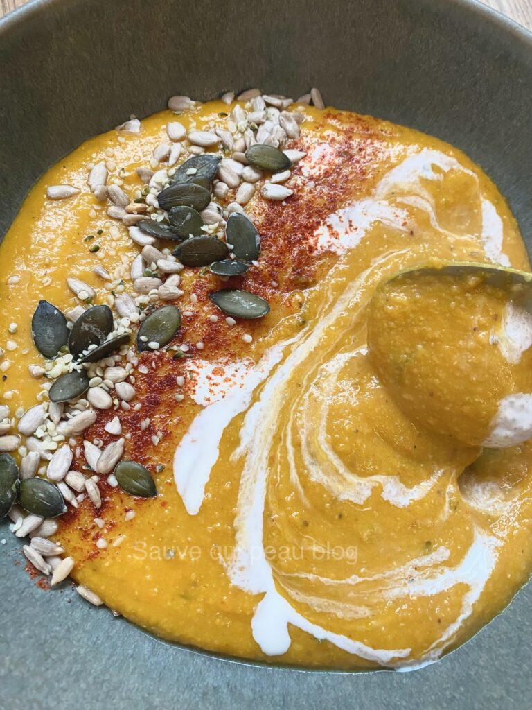 A la fois riche en protéine et en saveur, ultra crémeux mais aussi très très simple et rapide à faire, ce velouté de potiron aux lentilles corail et au tofu soyeux est un incontournable de l’hiver chez moi.